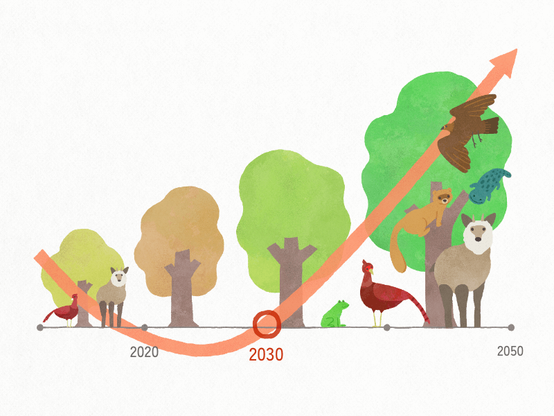 生物多様性の損失を止め、回復軌道に乗せるため、生態系に応じた自然環境の保全や野生鳥獣対策、外来生物対策への取組などを紹介