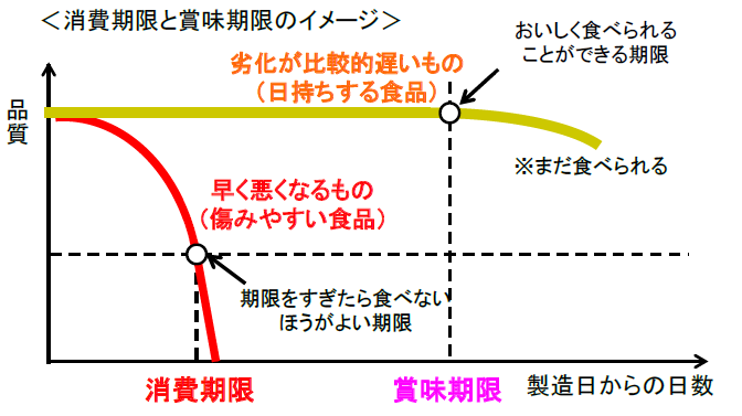 賞味期限は「おいしく食べることができる期限」で、比較的品質が劣化しにくい食品に表示されています。
