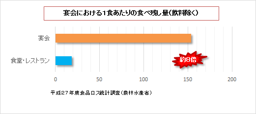 - 自席に戻り残った料理を楽しむ。幹事から「食べきり」を呼びかけ、食べ残しが多い大皿の料理をみんなで分け合うなど、協力して完食しましょう。