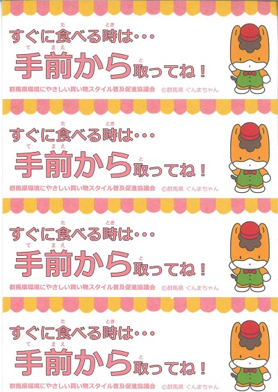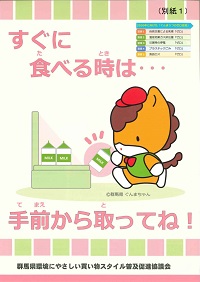 ぐんまちゃんの「てまえどり」レールポップや普及啓発チラシ(事務局作成)を、食品ロス削減月間(10月)に店舗に設置し、店舗利用者に対する「てまえどり」の普及啓発を図ります。