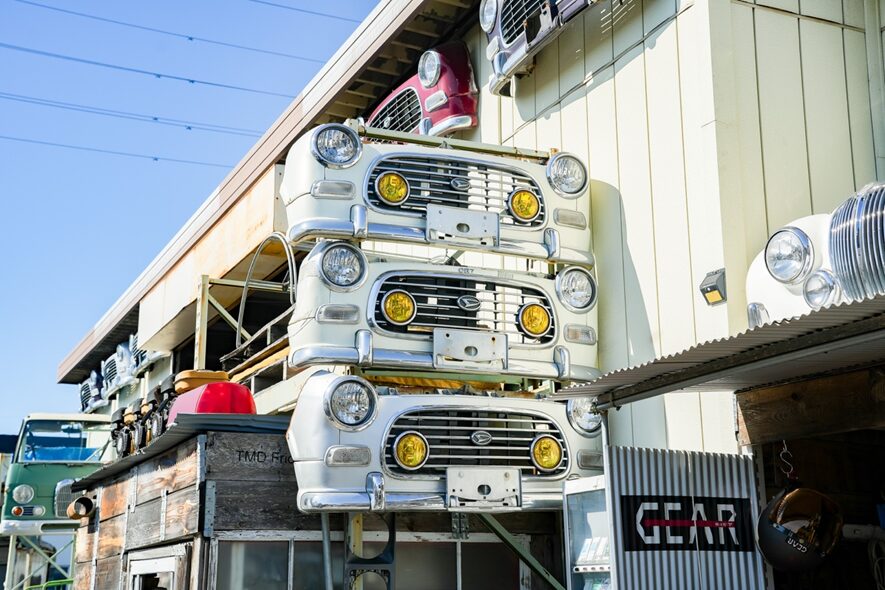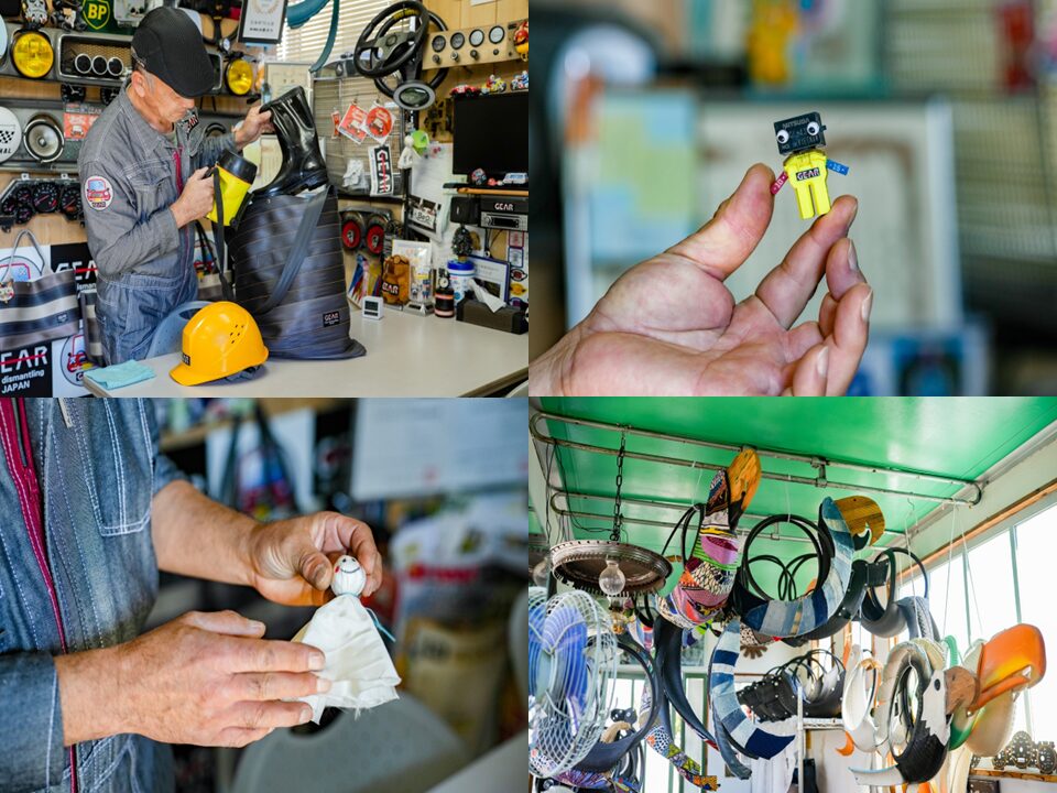 「自動車から出るものをいかに面白く、楽しくできるかをいつも考えています。変なおじさんでしょ?」と笑いながら、廃棄物として処分されるモノをアップサイクルすることで付加価値を生み出してお客さんとのコミュニケーションを増やし、信頼関係を醸成したいと考える上村さん。アイデアを活かした、楽しく、実用的な作品群は、私たちにさまざまな刺激を与えてくれます。
