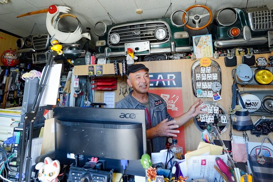 [自動車部品などが所狭しと展示されたギヤの事務所。「自分のことは、“解体おやじ”と呼んでもらえればいいです」と気さくに話す上村さん]