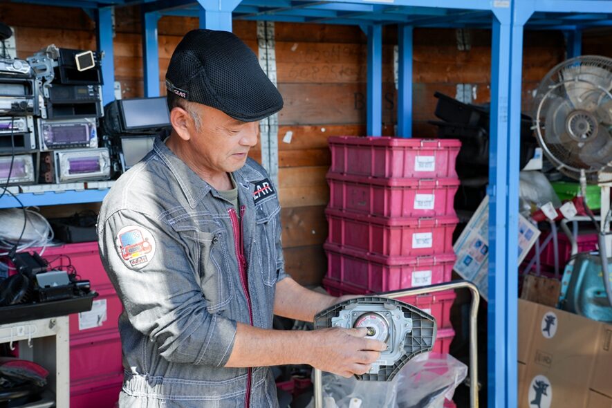 個人で自動車解体業を営む上村さんの解体は手作業の工程が多いのが特徴です。例えば、エアバッグも、ハンドルの中から一つひとつ、手で取り出します。