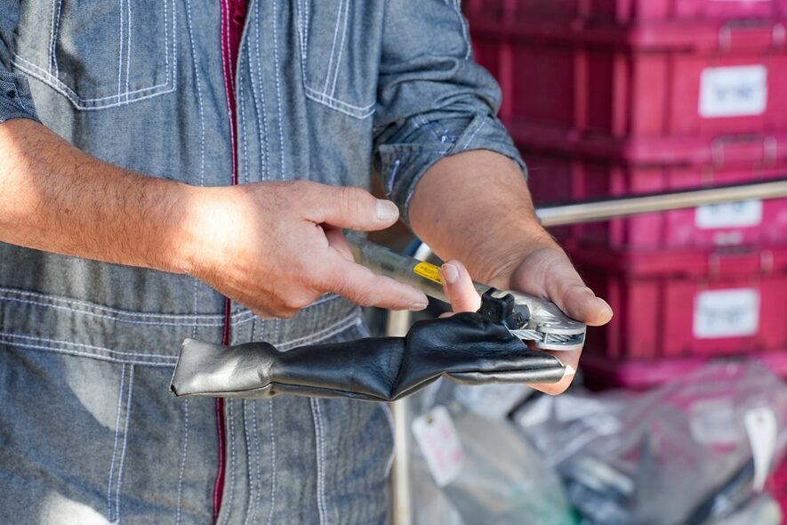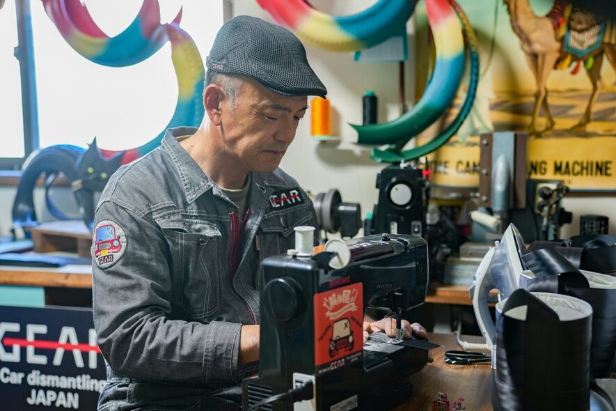 ギヤでは廃車にする自動車を預けてくれたお客さんのシートベルトとエアバッグからバッグをつくり、お客さんに渡すサービスを提供しています。まだまだ十分に乗れる車を解体することには「疑問も感じてきた」と話す上村さん。「車は大事に長く乗ってほしい。そして、廃車にする時には愛車を感謝の気持ちで送り出してほしいんですよ」