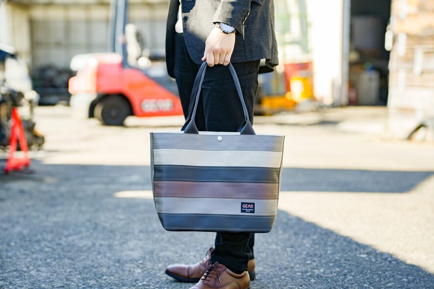 [グレー、白、黒、茶など色違いのシートベルトを縫い合わせてボーダー柄にしたトートバッグ。内袋はエアバッグでつくっている]