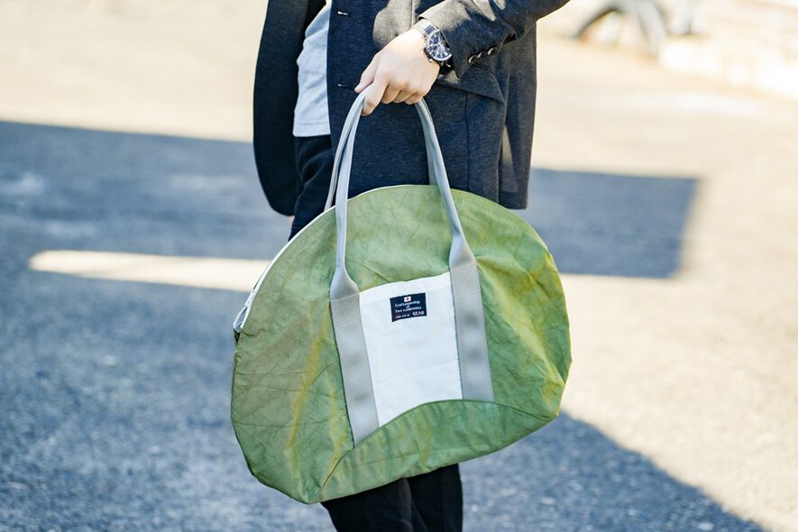 [こちらは白いエアバッグを染め、丸い形と耐久性を活かしてつくった「タフバッグ」]